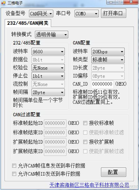 每当接收一帧数据时都会立即转发至232接口,并将相应的CAN帧ID填入指定位置。由于串行总线帧格式的要求,从而要求软件配置中的CAN参数(如类型和ID长度)必须与网络配置保持一致。