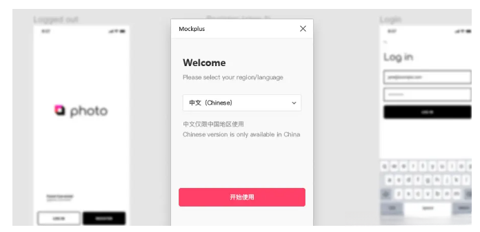 安装好以后就可以在浏览器中直接打开摹客插件了。在Figma的画布空白区域点击右键,依次选择Plugins > Mockplus,稍作等待后弹出主界面。初次使用语言一定要选择中文,才能使用中国区的服务器。