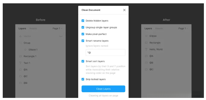 设计过程中难免产生一些排序混乱的空分组,无意义的隐藏图层或是命名不规范的图层。这款插件都可以帮你进行“智能打扫”。整理后,无论是自己还是合作设计师都能够更好地理解图层结构和逻辑。