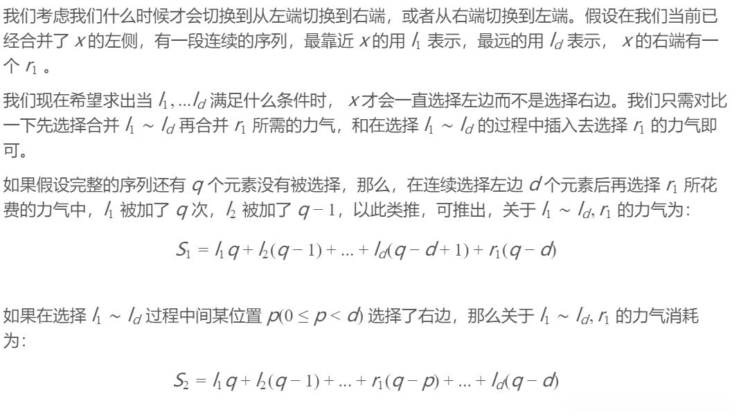 考虑一个长度为n的序列{a_i}(i=1到n),我们需要选择一个起始点x(1 ≤ x ≤ n),并从该起始点开始向左或向右展开"石子归并过程":每次操作将相邻两个元素相加形成一个新的元素,并使新的元素等于它们之和;同时所增加的成本即为其总和。(注:这里的"石子归并"指的是将两个相邻元素合并成一个新的元素)给定区间[l, r](l ≤ r ≤ n),求当起始点分别取自区间内的每个整数值时对应的最小总成本分别为多少?已知n ≤ 1e5且a_i ∈ [1, 1e8])。