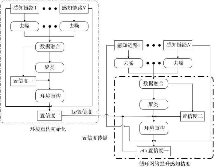 该算法基于先前的研究构建。环境中重建初始化的第一步则由高斯混合模型完成,在此之前,在高斯混合模型参数求解完成后,我们初始化了第一层信任度;随后,在初始构建的基础上以及其电磁传播特性,则能够推导出第二层信任度;随后,在综合考虑各层信任度后形成的总信任度过然能够显著提高对感知环境重建质量,并反向修正第二层的信任状态;从图5可以看出,在持续迭代更新变量 t 的过程中,则可以使整体重建质量得到进一步优化;双置信度传播算法循环迭代过程直至满足特定终止条件为止: