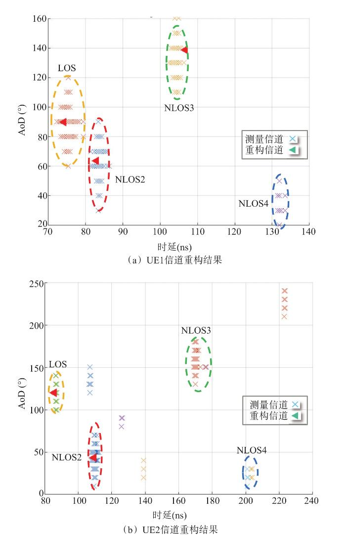 UE设备的通信信道重构结果显示于图9中;其中使用"×"符号标识测得的信道状态,"三角形"则代表重建的通道模型;所有重建通道均基于一次反射路径。在重建通道参数中所测定的方向角(AoD)及其延迟与实际测得值高度一致。