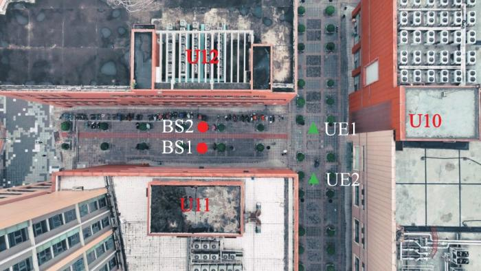 通过图7所示的示意图,可以观察到室内外场景及基站(BS)与用户设备(UE)的位置关系。典型的城市街道环境中部署了两个基站,并利用自发自收敛技术实现了网络化的室内环境感知,在此基础上能够显著提升室内场景感知范围和精度。此外,在另一条城市街道上设置了两个用户设备(UE),完成了信道数据采集工作,并以此为基础验证基于环境感知的技术方案的有效性。