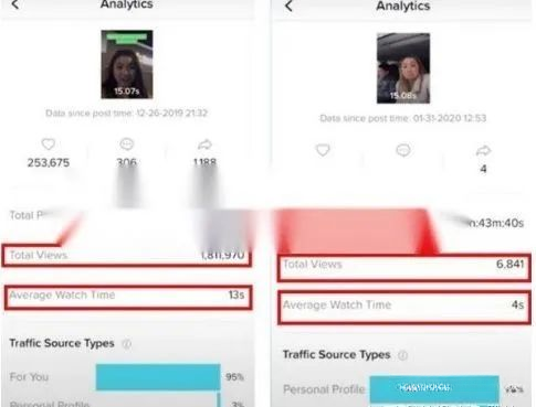 举例而言,在拥有180万播放量的视频中平均每次观看持续时间约为13秒;与此相反的是只有4秒的平均观看时间存在于1万播放量视频中。这表明当你的视频观看时长超过某一特定阈值后就会被平台自动推送到更大的流量池中