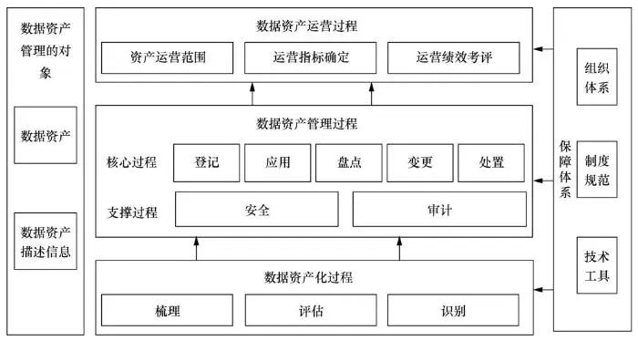 在开展数据资产管理工作时,首先应充分考虑数据资产管理与组织战略、信息化战略和数据战略的关系,从而确立管理目标,统筹协调业务、技术和数据等因素,指导数据资产管理实现最终价值。在数据资产管理工作中,需明确管理范围和对象,制定组织、制度、技术和资源等方面的保障机制,通过数据资产化过程、数据资产管理过程、数据资产运营过程和数据资产管理保障机制等一系列活动指导数据资产管理工作的实施。