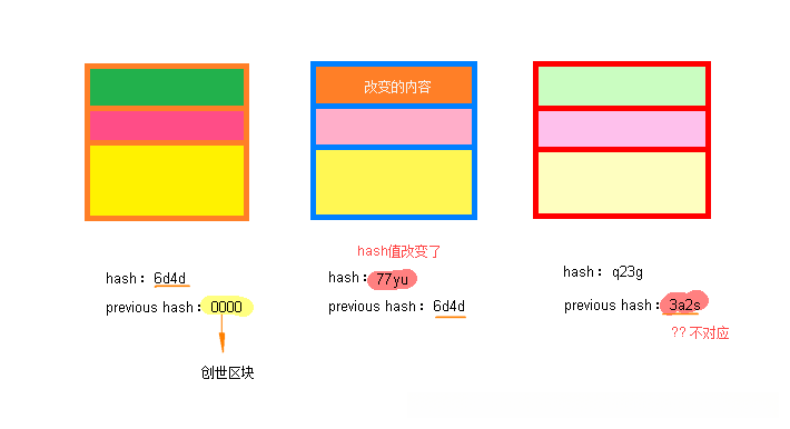当2号区块的哈希值发生更改时(即它的哈希值发生变化),该变化将导致与3号区块上一个节点的哈希值不同(即两者不一致)。此时(即因此),3号新区块及其后续所有新区块都会失效(因为这些新区块不再存储直接父节点的有效哈希值)。因此(由此可见),只要修改任意新区块的内容,则整个后续的新区块链节点都会失效。