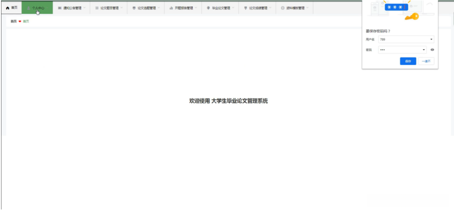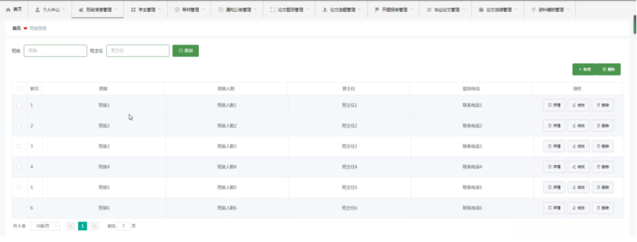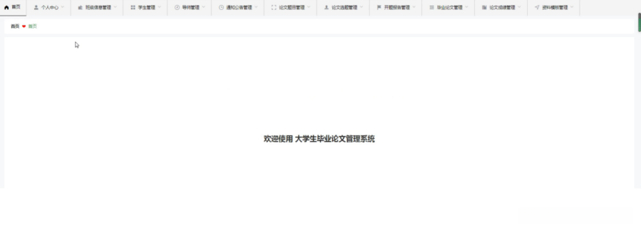 管理员登录进入大学生毕业论文管理系统可以查看首页、个人中心、班级信息管理、学生管理、导师管理、通知公告管理、论文题目管理、论文选题管理、开题报告管理、毕业论文管理、论文成绩管理、资料模板管理等信息,如图5-2所示。