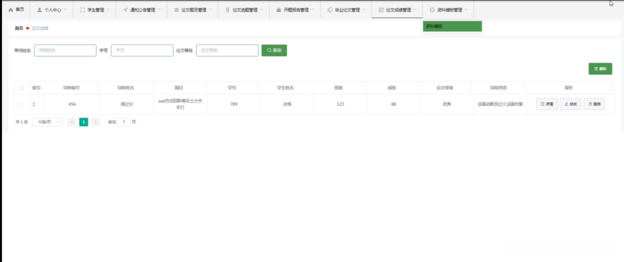 论文成绩管理,在论文成绩管理页面中可以查看索引、导师编号、导师姓名、题目、学号、学生姓名、班级、成绩、论文等级、导师评语等信息,并可根据需要进行修改或删除等操作,如图5-11所示。
