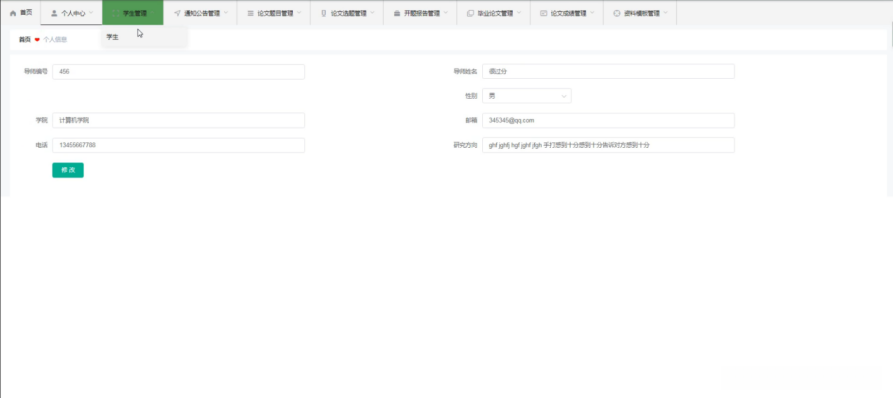 个人中心,在个人中心页面中通过填写导师编号、导师姓名、性别、学院、邮箱、电话、研究方向等信息进行进行修改,如图5-14所示。