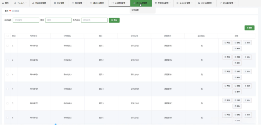论文题目管理,在论文题目管理页面中可以查看索引、导师编号、导师姓名、题目、研究方向、课堂要求、是否被选等信息,并可根据需要进行选题、修改或删除等操作,如图5-7所示。