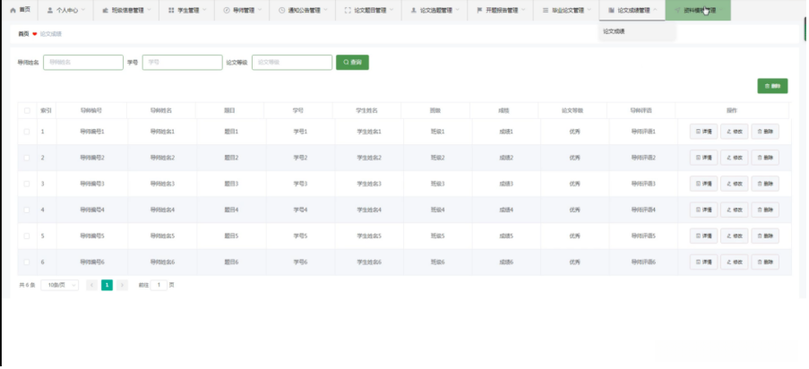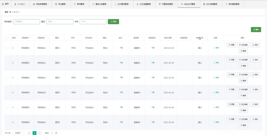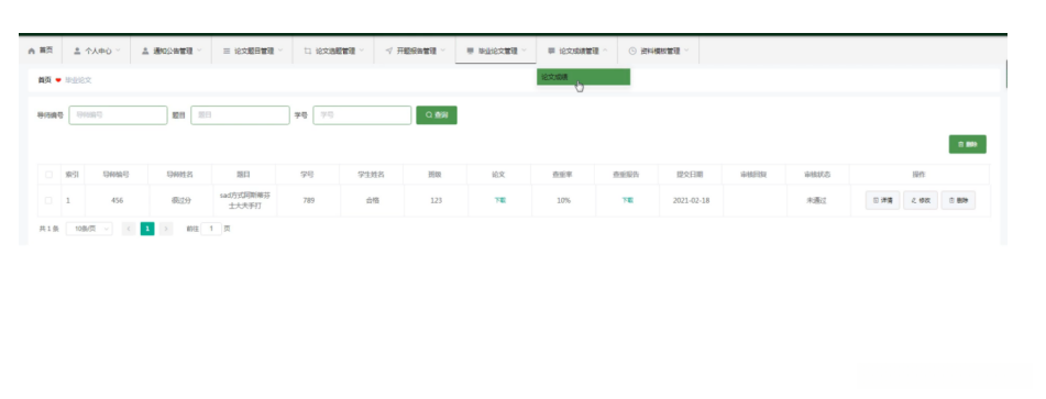 毕业论文管理,在毕业论文管理页面中可以查看索引、导师编号、导师姓名、题目、学号、学生姓名、班级、论文、查重率、查重报告、提交日期、审核回复、审核状态、审核等信息,并可根据需要进行论文成绩、修改或删除等操作,如图5-10所示。