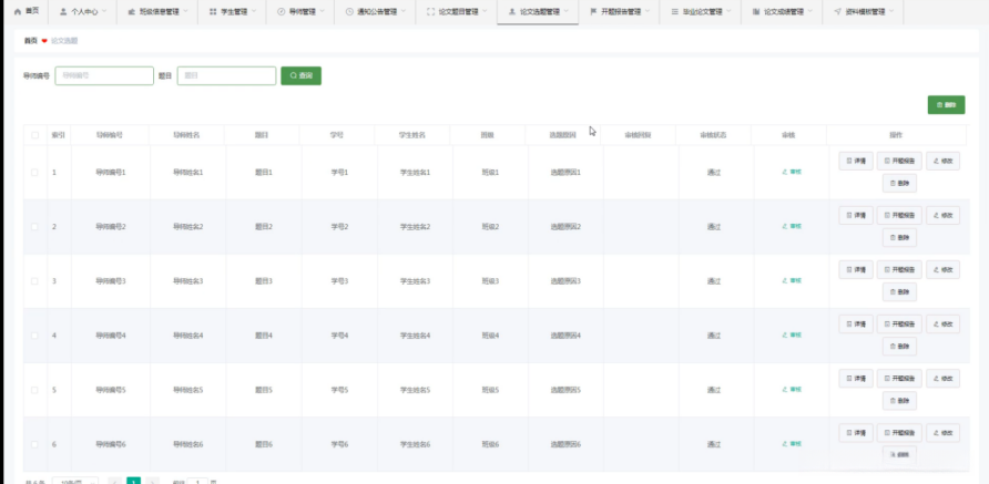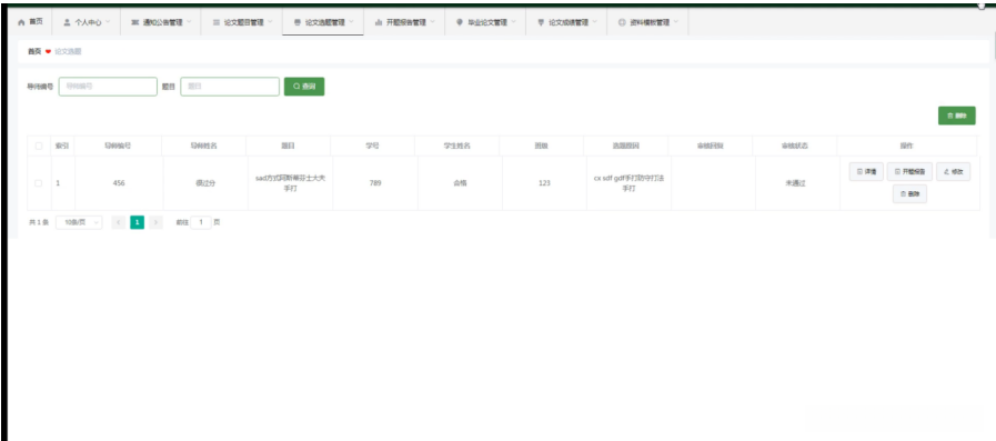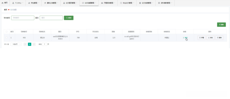 论文选题管理,在论文选题管理页面中可以查看索引、导师编号、导师姓名、题目、学号、学生姓名、班级、选题原因、审核回复、审核状态、审核等信息,并可根据需要进行修改或删除等操作,如图5-16所示。