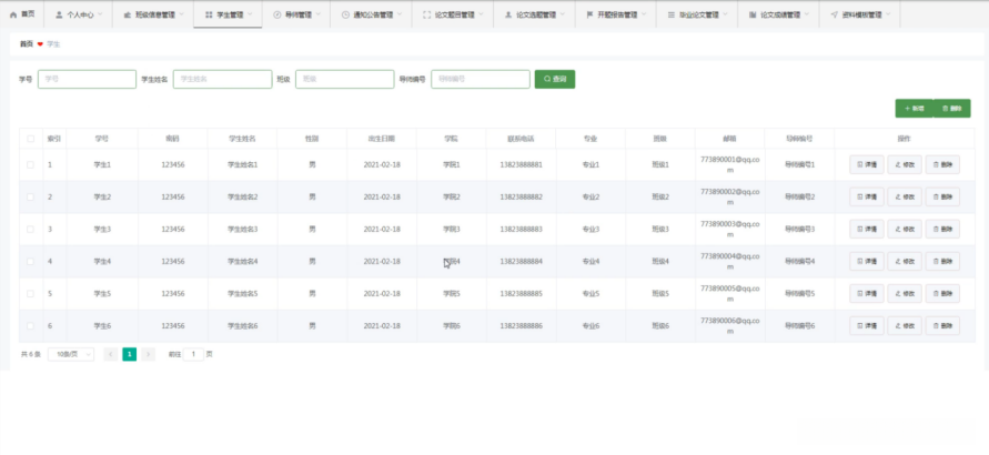学生管理,在学生管理页面中可以查看索引、学号、密码、学生姓名、性别、出生日期、学院、联系电话、专业、班级、邮箱、导师编号等信息,并可根据需要进行修改或删除等操作,如图5-4所示。
