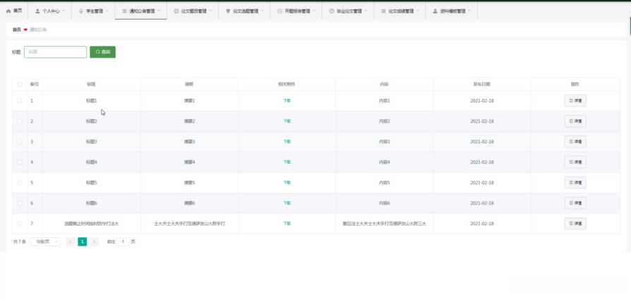 通知公告管理,在通知公告管理页面中可以查看索引、标题、摘要、相关附件、内容、发布日期等信息,如图5-15所示。
