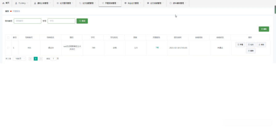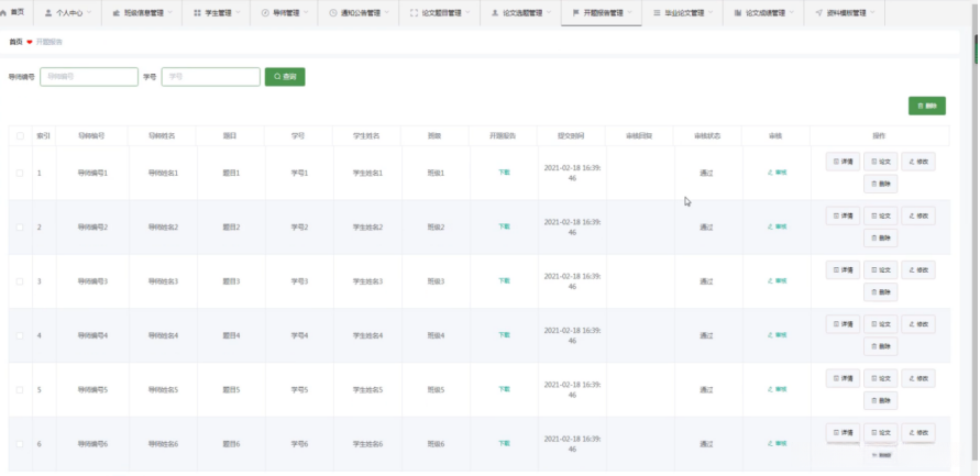 开题报告管理,在开题报告管理页面中可以查看索引、导师编号、导师姓名、题目、学号、学生姓名、班级、开题报告、提交时间、审核回复、审核状态、审核等信息,并可根据需要进行论文、修改或删除等操作,如图5-9所示。