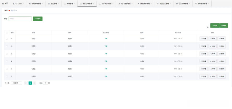 通知公告管理,在通知公告管理页面中可以查看索引、标题、摘要、相关附件、内容、发布日期等信息,并可根据需要进行修改或删除操作,如图5-6所示。