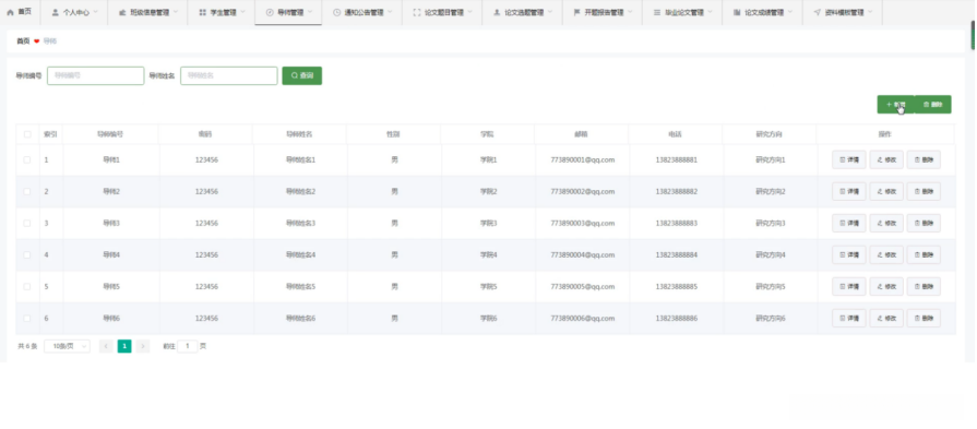 导师管理,在导师管理页面中可以查看索引、导师编号、密码、导师姓名、性别、学院、邮箱、电话、研究方向等信息,并可根据需要进行修改或删除等操作,如图5-5所示。