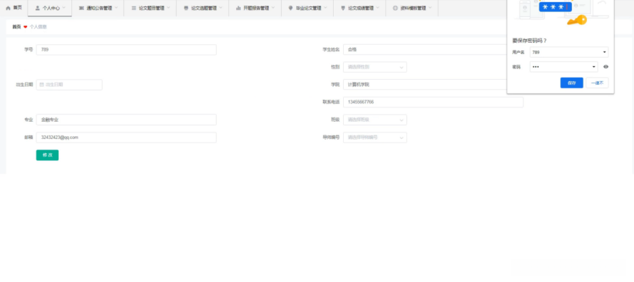 个人中心,在个人中心页面中通过填写学号、学生姓名、性别、出生日期、学院、联系电话、专业、班级、邮箱、导师编号等信息进行进行修改,如图5-19所示。