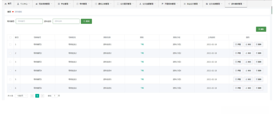 资料模板管理,在资料模板管理页面中可以查看索引、导师编号、导师姓名、资料名称、资料、资料介绍、上传时间等信息,并可根据需要进行修改或删除等操作,如图5-12所示。