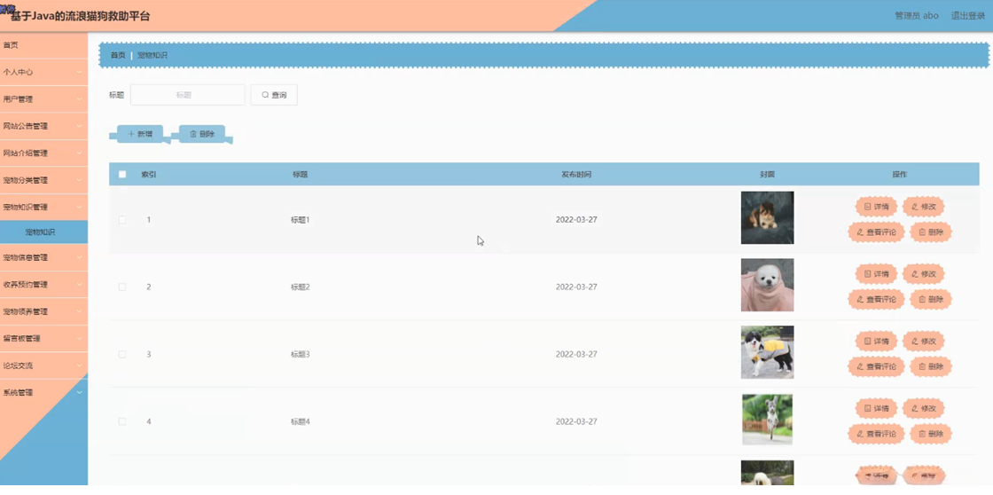 该宠物知识管理页面提供了全面的功能模块设计,在线对索引、标题等基础信息进行详情处理,并支持对内容进行修改、评论查看和删除等操作。其中包含封面信息设置功能以及互动功能如图5-9所示