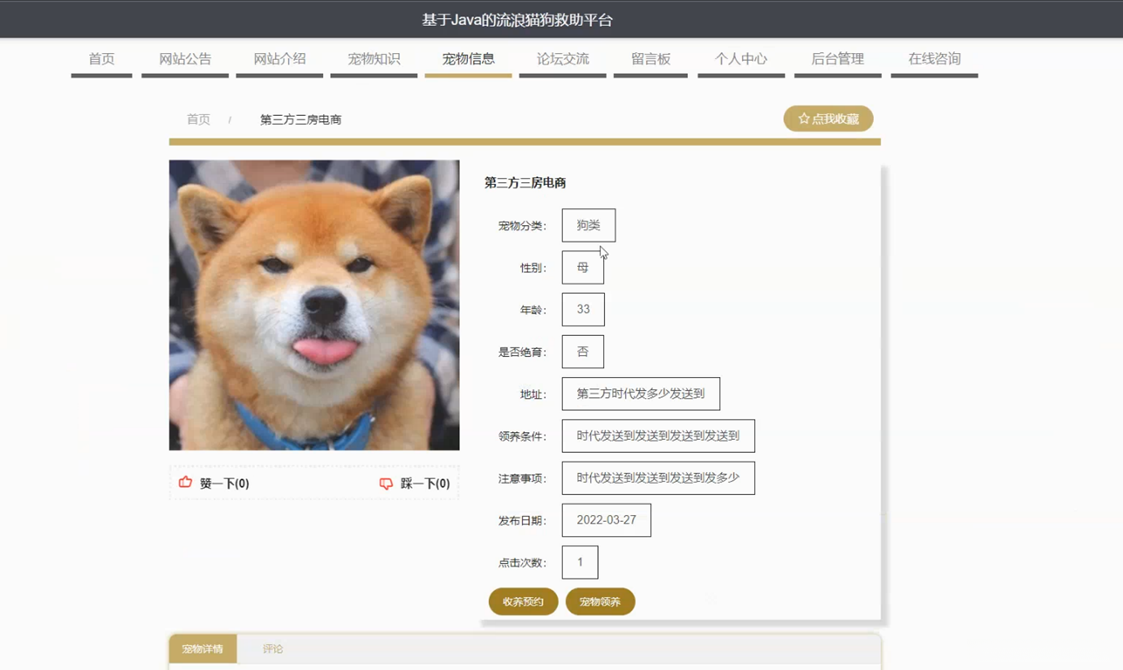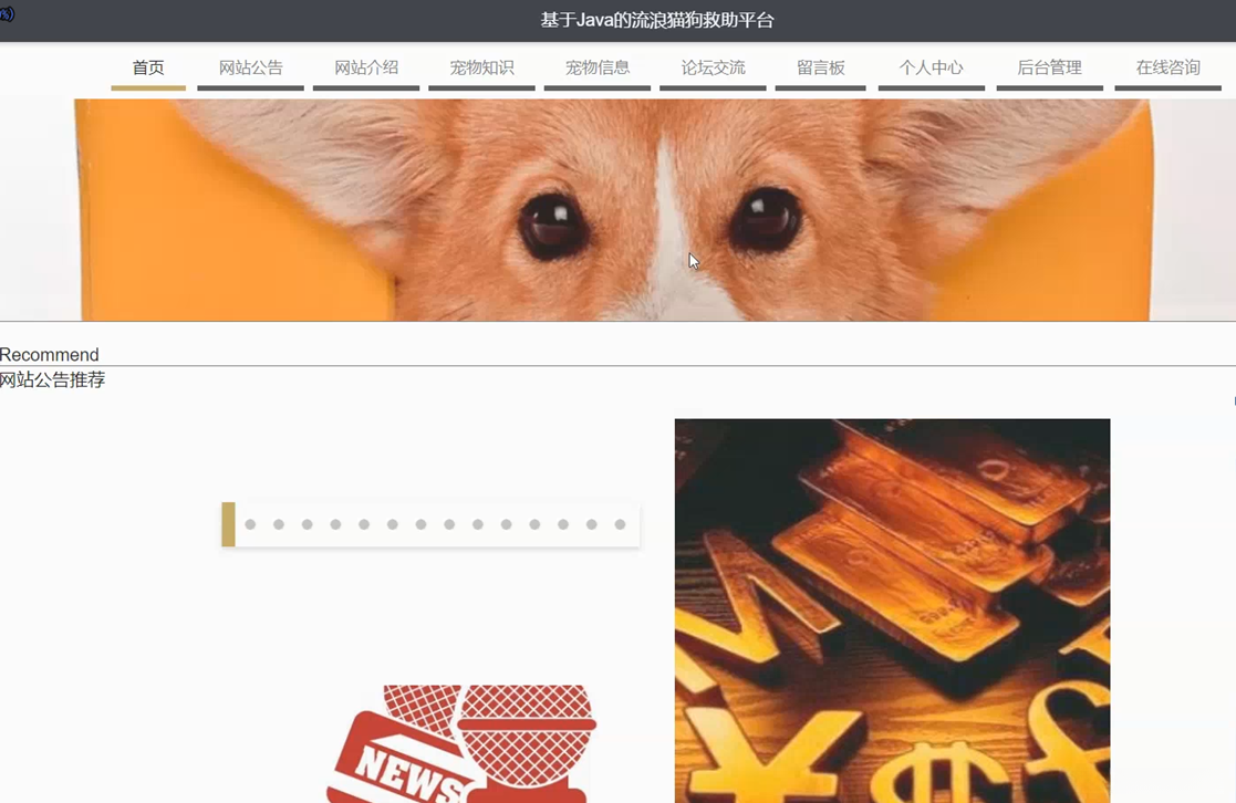 系统首页的主要功能包括首页展示、公告信息呈现、网站概况包含有、宠物相关知识展示、宠物动态更新提供、交流平台呈现、留言反馈渠道设置、个人中心功能配置以及后台管理模块配置等,并可进行相应操作功能设置。如图5-1所示