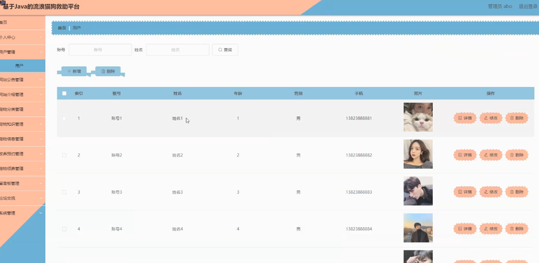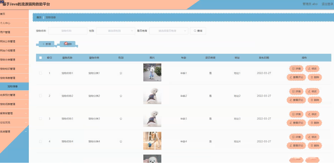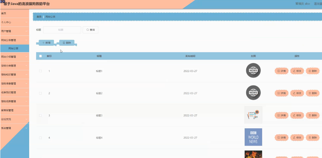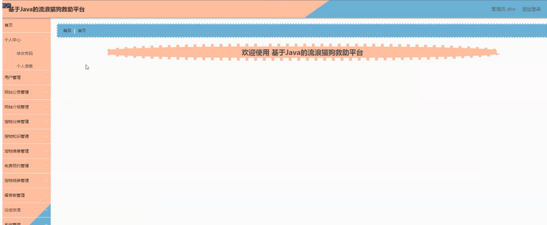 管理员登录系统后,具备对首页、个人中心、用户管理等功能的操作权限,并能完成网站公告、宠物分类等各项功能的具体操作。具体操作界面如图5-5所示。