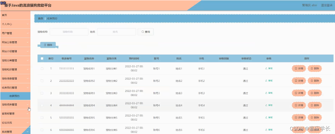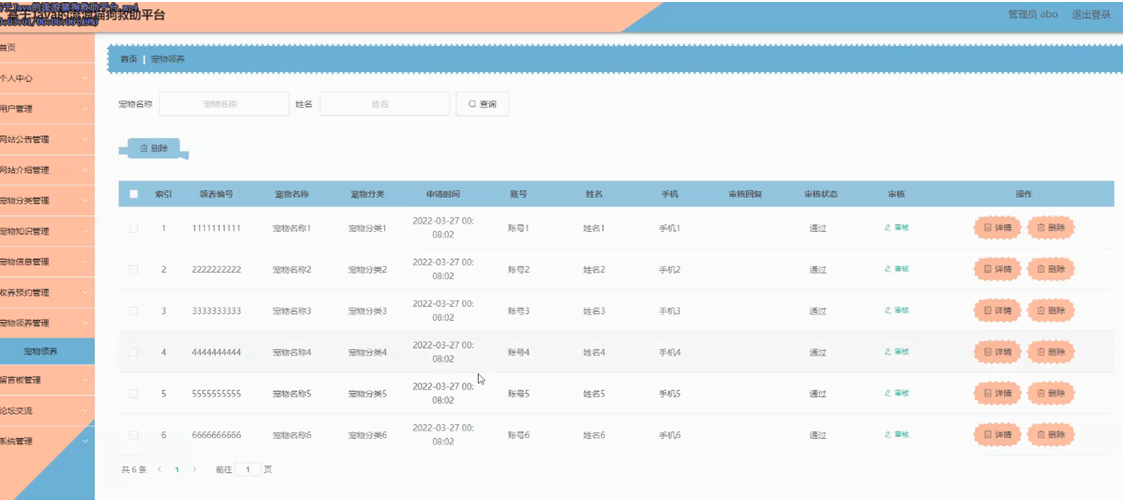 宠物领养管理系统,在宠物领养管理界面内可对索引、领养编号、宠物名称、宠物分类、申请时间、账号、姓名、手机、审核回复以及审核状态等内容进行详情浏览或记录删除等基本操作,请参见图5-12。