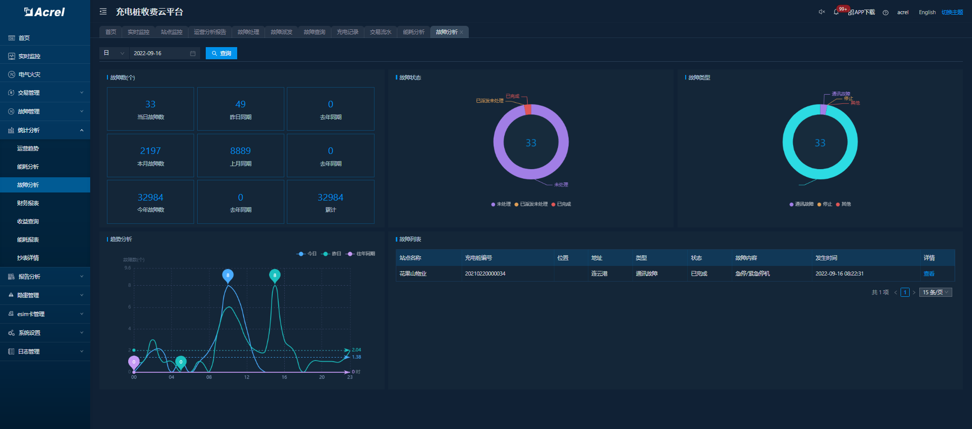 通过统计分析手段来支撑运营趋势与收益的数据统计工作;便于用户借助曲线图和能耗数据等工具来观察桩的充电运营情况