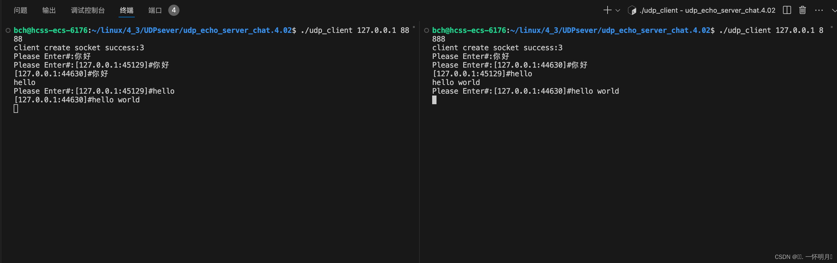 1. bch@hcss-ecs-6176:~/linux/4_3/UDPsever/udp_echo_server_chat.4.02$ ./udp_server 8888