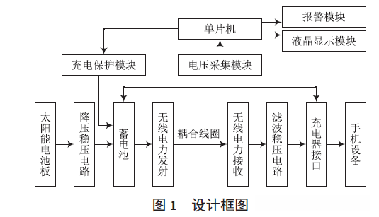 该充电器主要由太阳能电池板、降压稳压电路、无线电力传输电路、单片机电压采集监控电路、无线电力接收电路、手机充电电路及充电保护电路等部分构成,并通过将太阳能转化为电能实现对手机等移动设备的无线供电功能。具体设计框图见图1