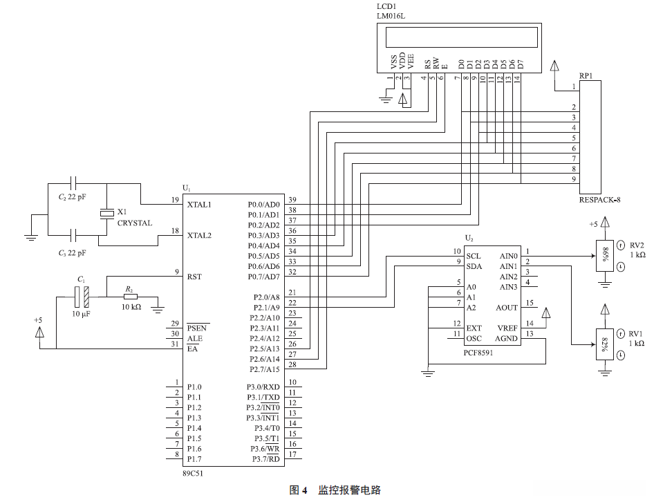 通过智能控制策略确保充电过程的安全与高效管理。 采用单片机技术实施充电过程的智能化管理,并通过电压监测模块与安全防护装置协同作用来全面保障蓄电池的安全运行。 监控与报警系统及其相关电路配置如图4所示。