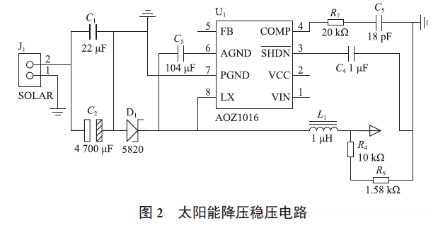 该系统采用太阳能电池板高效地将光能转化为电能,并针对太阳光照强度波动导致的系统性问题进行了优化设计。具体而言,在单个太阳能电池板无法满足稳定运行需求的情况下,在电路中加入了多块相同的太阳能电池板进行串并联组合使用,在此基础之上再结合稳态电源变换器对系统进行调节控制,并最终完成对储电设备的有效供电保障工作。在电路设计中采用了DC-DC型降压稳流芯片AOZ1016来进行降级调制操作,并通过调节R4和R9等关键电阻元器件来设置目标工作状态下的输出参数值:其中当两个电阻分别取值于 R_4 = 10\text{k}\Omega 、 R_9 = 1.58\text{k}\Omega 时,在正常负载运行状态下能够精确地输出标准的工作端口电压值 V_{out} = 5\text{V}至储能设备。