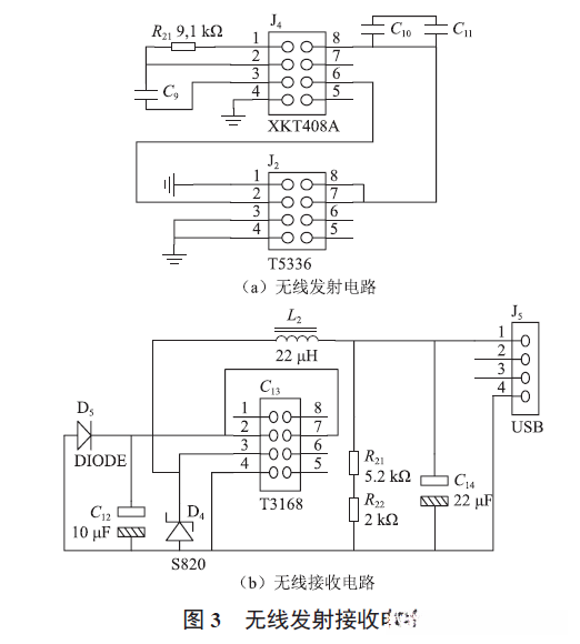在XKT-408A 控制时, 使用T5336芯片输出可调节的低电平信号. 两者的电压差从而影响了L C振荡回路的工作状态, 最终实现了稳定的高频电磁波发射. 接收端输入的是高频振荡信号, 如果直接向手机供电会导致严重的损害. 因此, 在接收过程中需将高频信号转换为稳定直流电源后再进行降压稳压处理. 当接收到无线供电信息时, 系统会首先采用二极管完成全波整流处理, 得到稳定直流电能后再由T3168芯片组成的降压稳压模块输出标准五伏电源以供手机使用