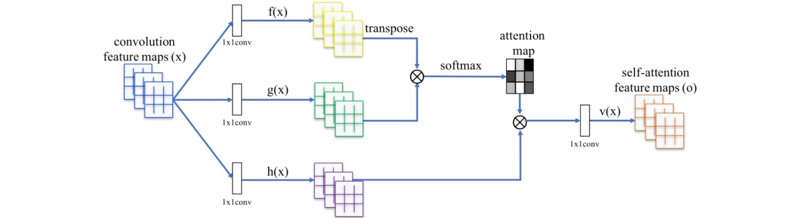 在卷积网络的自注意力机制中,首先生成输入特征x的键特征f(x)、查询特征g(x)以及值特征h(x);接着,通过点积注意力机制生成自注意力特征图。