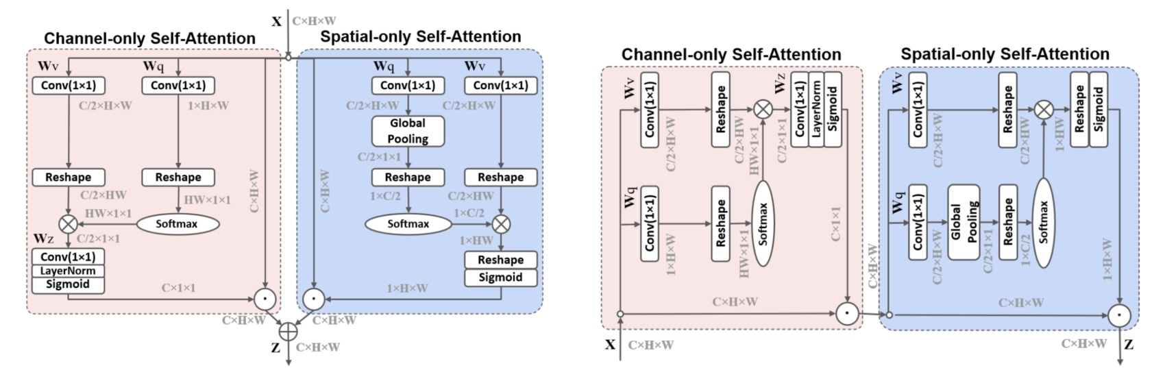 该机制借鉴了摄影领域中的极化滤波技术。首先,该方法在通道维度或空间维度上对特征进行压缩处理,随后会对损失的强度范围进行相应的增强或抑制操作。