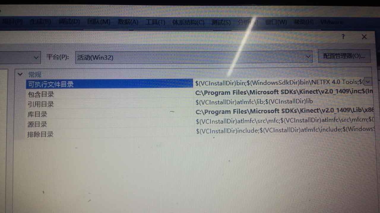 (2).在属性对话框,在左边栏的 <VC++目录>->< 包含目录>中,编辑,浏览选择kinect SDK的安装目录(C:\Program Files\Microsoft SDKs\Kinect\v2.0_1409\inc)选择确定; <库目录>中,编辑,浏览选择kinect SDK的安装目录(C:\Program Files\Microsoft SDKs\Kinect\v2.0_1409\lib\X86)选择确定;