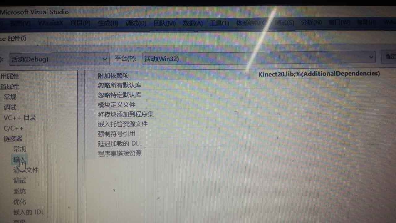 (3). 添加特定库 在链接器->输入中设置附加依赖项,填入kinect20.lib。,或者在程序中添加#pragma comment (lib,"Kinect20.lib")
