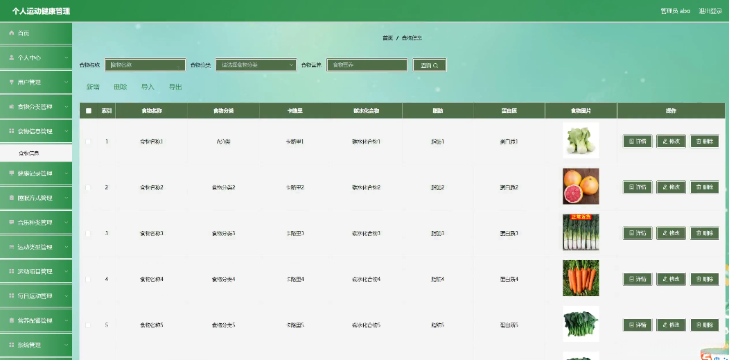 本项目基于Spring Boot框架进行开发,并通过其强大的依赖注入机制、OOB(Object-Oriented Bus)模式以及RESTful API支持能力来构建出高效的可扩展系统架构。前端使用HTML5、CSS3以及JavaScript技术实现友好的用户界面交互体验。数据库主要使用MySQL来存储包括用户信息在内的重要数据项,并且还包含食物数据与健康记录等关键字段。同时应用机器学习算法于用户的健康数据上以提供个性化的健康建议与优化方案。