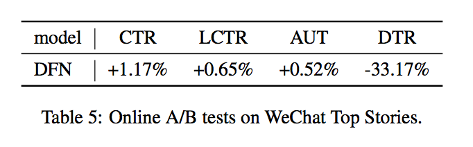 线上A/B实验主要观察CTR、list-wise CTR(LCTR)、平均使用时间AUT、用户显式负反馈的比例DTR等指标,可以看到,DFN在这几项指标中均有较大的提升,取得了不错的线上效果: