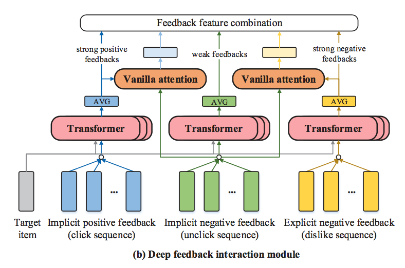该模块主要包含两个部分,第一个部分是单反馈类别内部交互部分,这里对三种反馈序列,分别使用Transformer去建模序列内部的item的交互信息。最后通过Avg-pooling的方式,分别得到三个序列的输出,分别计作fc(隐式正反馈),fu(隐式负反馈)和fd(显式负反馈)。