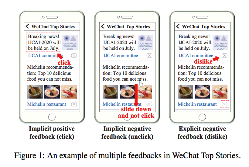 在微信看一看场景中,可以获取到用户显式负反馈/隐式正反馈/隐式负反馈三种反馈类型的信息,如下图所示: