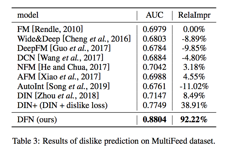 这一部分将1-p(x)看作用户不喜欢target item的概率,如果按照1-p(x)进行排序,将用户有过显式负反馈的item排在前面,那么该实验的AUC会越高,可以看到,DFN在不喜欢预估实验,同样有一个较大的AUC的提升: