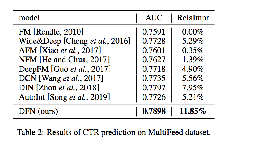可以看到,DFN相较于FM,WD,DeepFM等模型,有一个比较明显的AUC的提升。