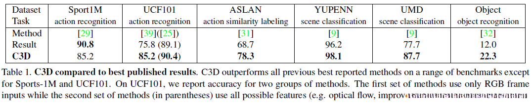3.我们的C3D特征(通过3D卷积提取的特征)应用在简单的线性分类器上比当下最好的方法在4个不同的评估基准上要更好,在另外两个评估基准上与之相当。