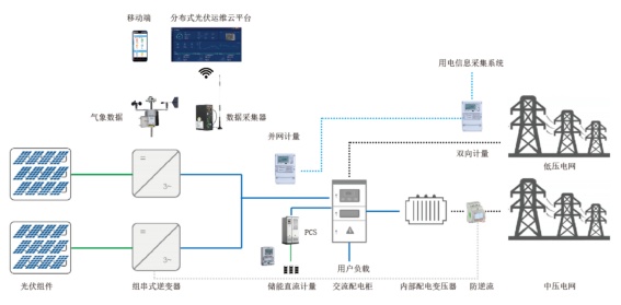 光伏阵列可连接组串式逆变器,并可在集流箱中整合后再接入逆变器系统,在380V的企业主电源网络中实现自发发电与多余电量上网的目标。在380V配电节点前应配置计量装置用于测量光伏发电效率,在企业电网与公共电网的连接点还需设置双向计量装置以实现能量往来的精确计算与管理,并确保所有记录数据通过专用平台传输至供电部门进行及时分析与核算