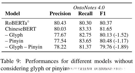 不论是删除字形嵌入还是删除拼音嵌入的方式都会导致性能有所降低。然而删除两者后对F1值的影响最为显著,并且约降低了2个百分点。