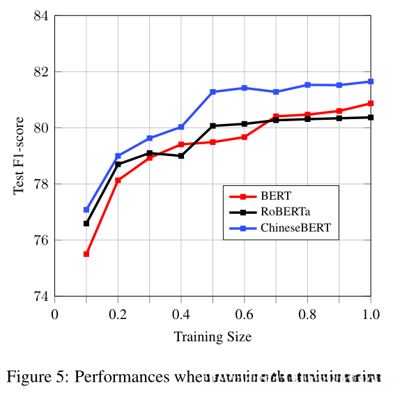 当训练数据量未达到30%时,在这种情况下应用ChineseBERT所带来的提升幅度较小;一旦超过30%,其性能将显著超越现有水平。这是因为汉语拼音的学习仍需充足的训练样本以确保准确构建字形与声调编码。这些必要参数的建立依赖于充分的数据支撑才能实现稳定可靠的学习效果。