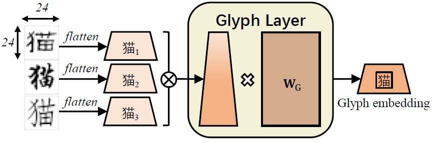 - 基于不同字体的中文字符,在可视表面字符形式中提取了\text{字符语义} ,从而更容易获取\text{视觉特征} 。