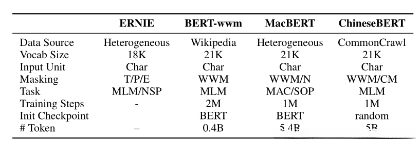 在预训练过程中采用了全词掩码(Whole Word Masking, WWM)以及字符掩码(Char Masking, CM)。