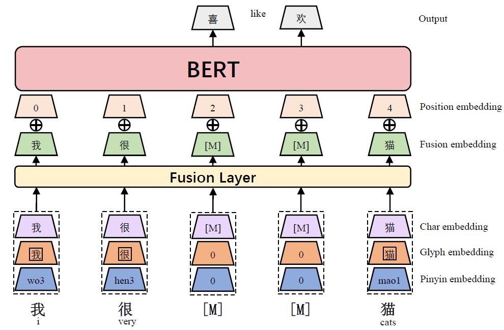 - 在预训练过程中整合了中文字符的拼音和字形信息。